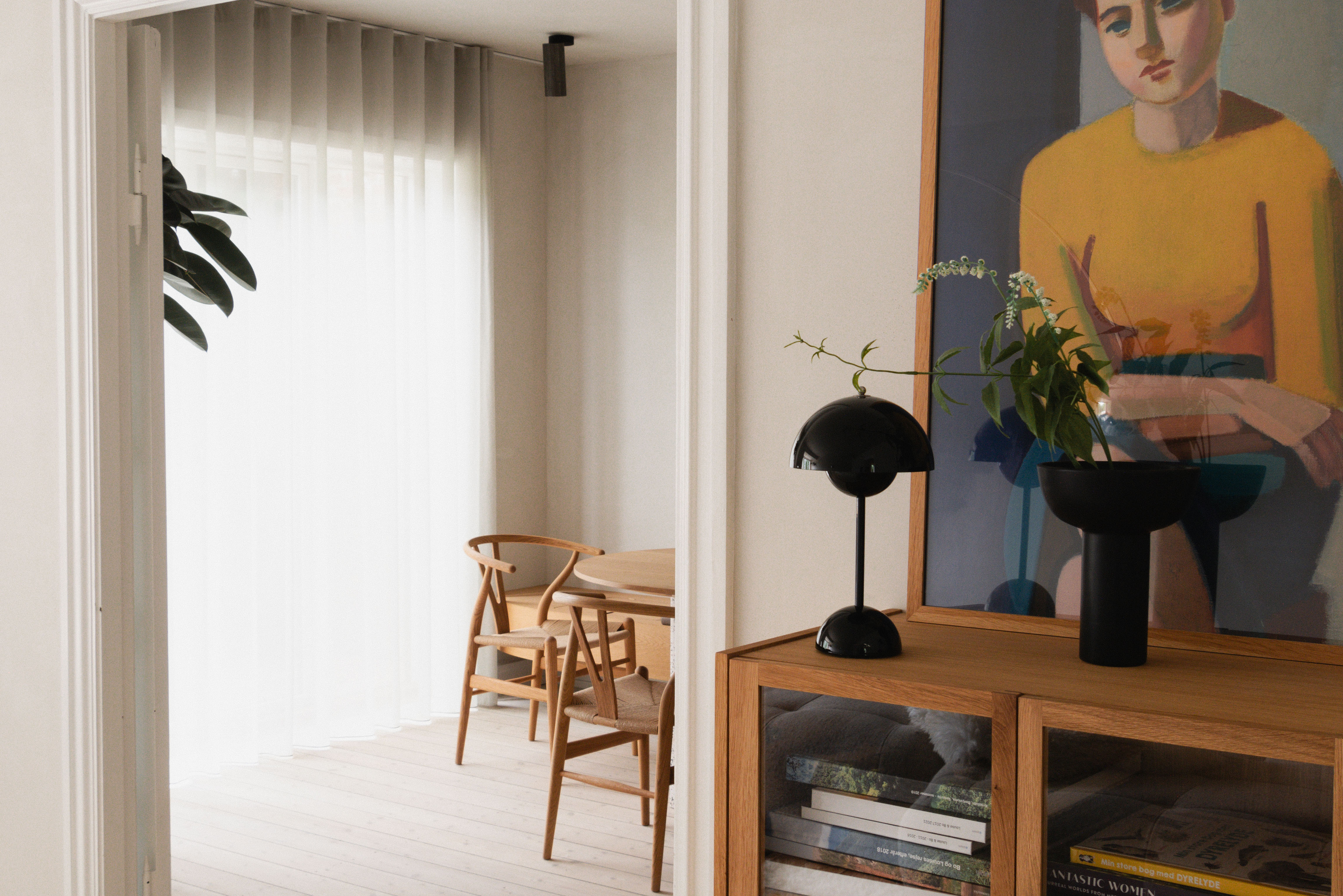 FRB House is a townhouse project constructed in 1928, designed by architect Thorkild Henningsen. It locates in the Fuglebakke quarter of Frederiksberg. The goal is to preserve the majority of the existing interior architecture following a recent renovation of the house prior to the takeover.The color scheme mainly comprises of warm beige tones with accents of oak wood, adding a playful touch with vibrant colors to balance its Scandinavian, norm-core aesthetic. The walls and ceilings are painted with dolomite plaster, giving a uniform tone that creates an enlarged illusion within space.In collaboration with Vermland and Studio Alice Chan, we introduced unique bespoke furniture to seamlessly blend with the surroundings. The key idea is to integrate built-in furniture with its surrounding walls, while also carving out walls to bring natural light to a previously dark space.